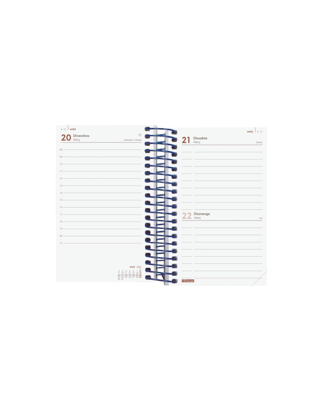 Agenda de espiral con la cubierta de polipropileno translúcida. Espiral metálico y cierre de goma elástica. Papel de 70gr. FSC® y uñero microperforado. Interior con día página, sábado y domingo en la misma página. Contiene datos personales, onomástica, festivos, fechas a destacar, horarios, mapas, etc.