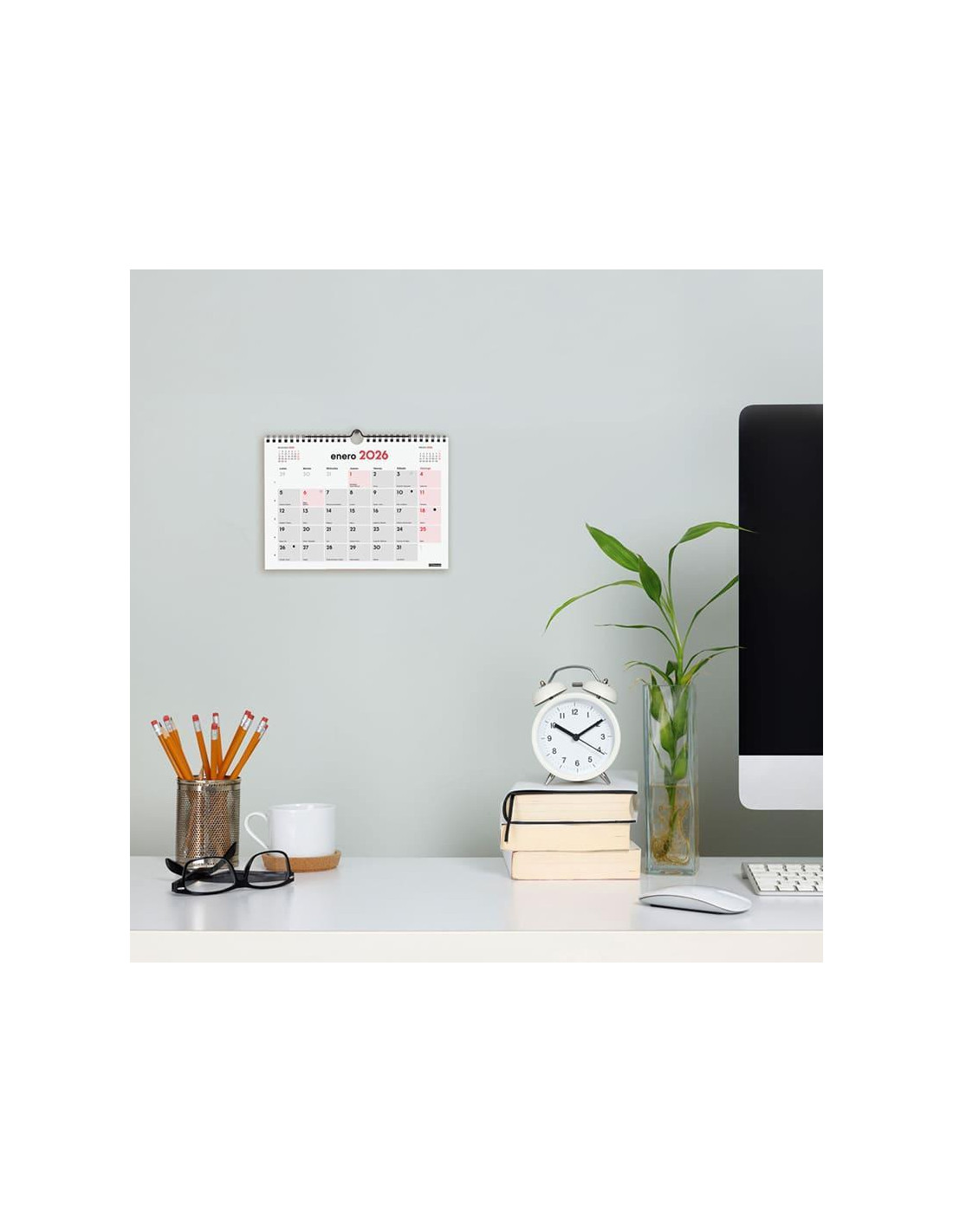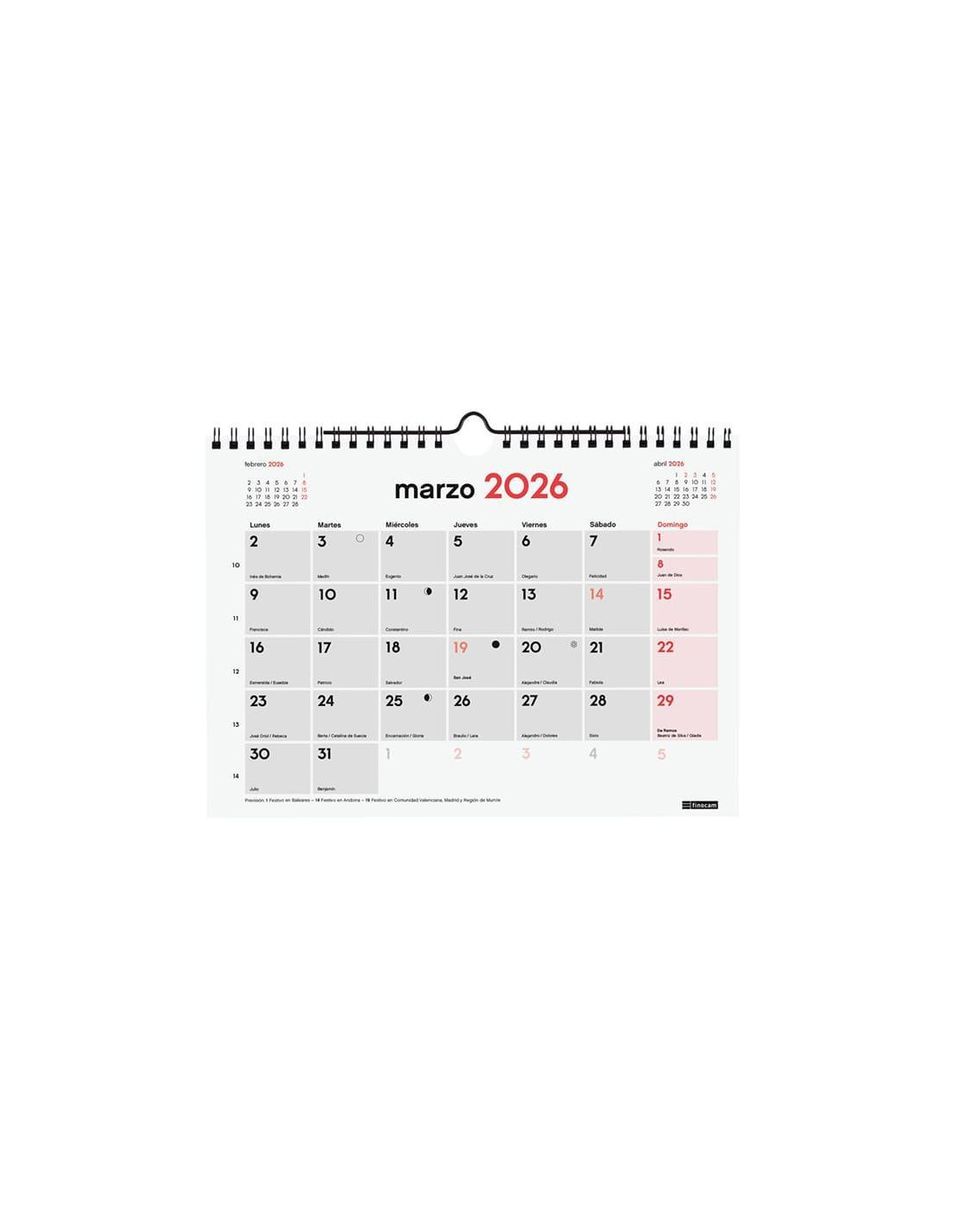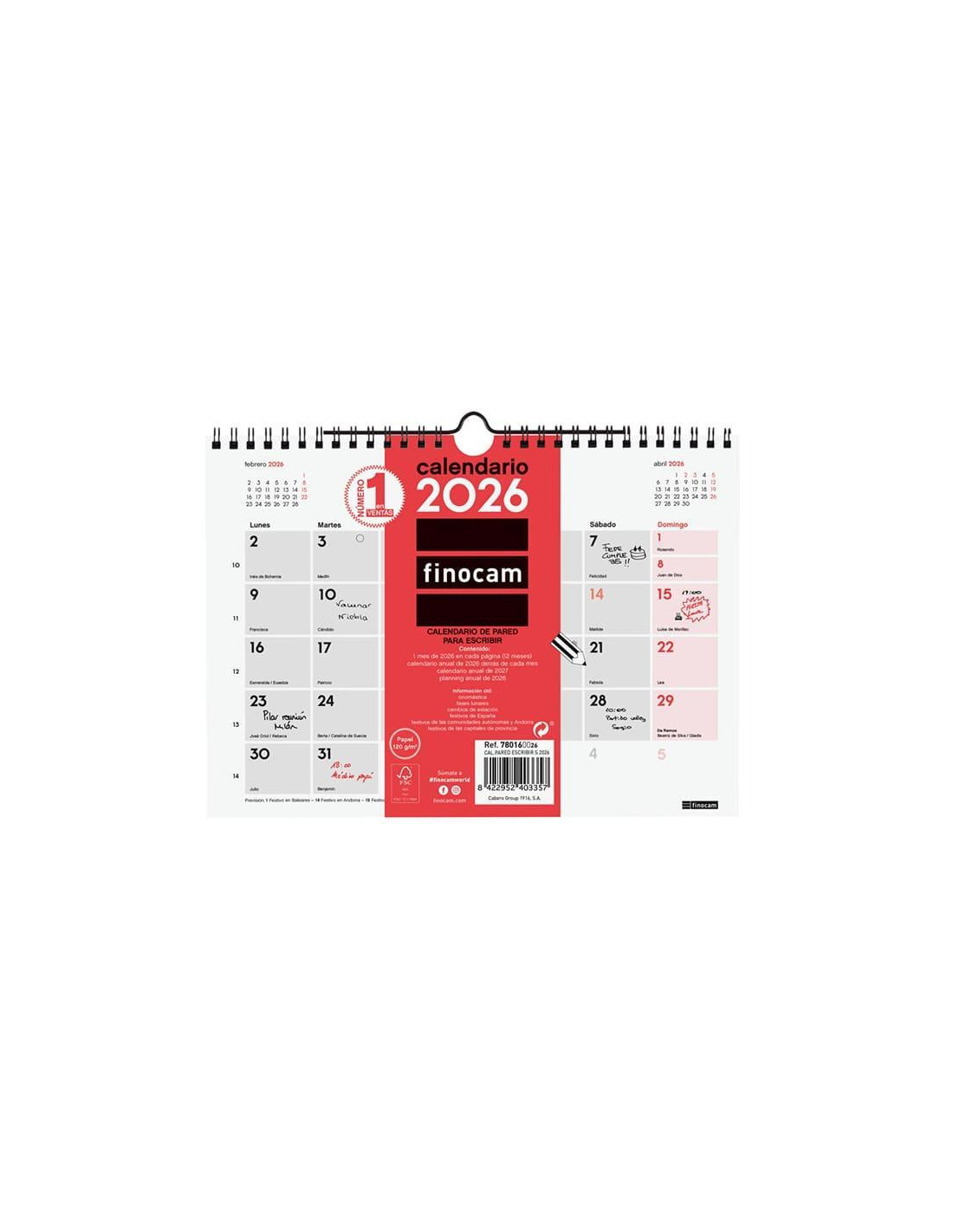 Calendario de pared con espacio diario para anotaciones, perfecto para planificar. Encuadernado con doble espiral y colgador. Con mes anterior y posterior en cada página. Contiene información útil y de interés; onomástica, festivos, cambios de estación, etc. Papel de 120gr. FSC. Formato: 21x15cm.