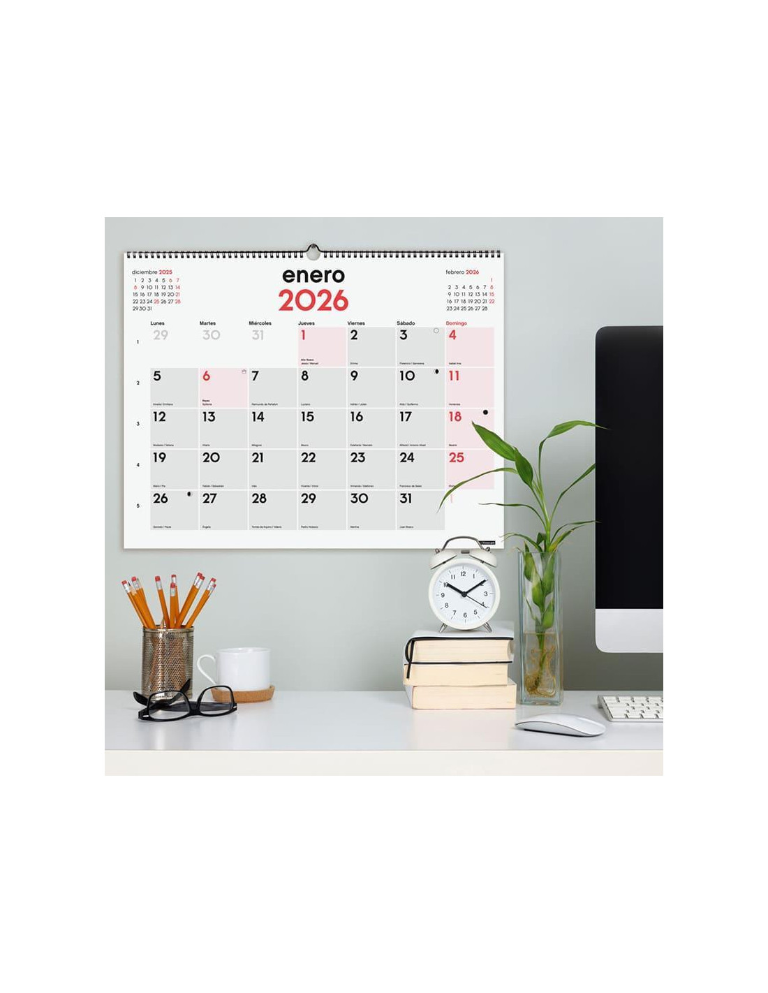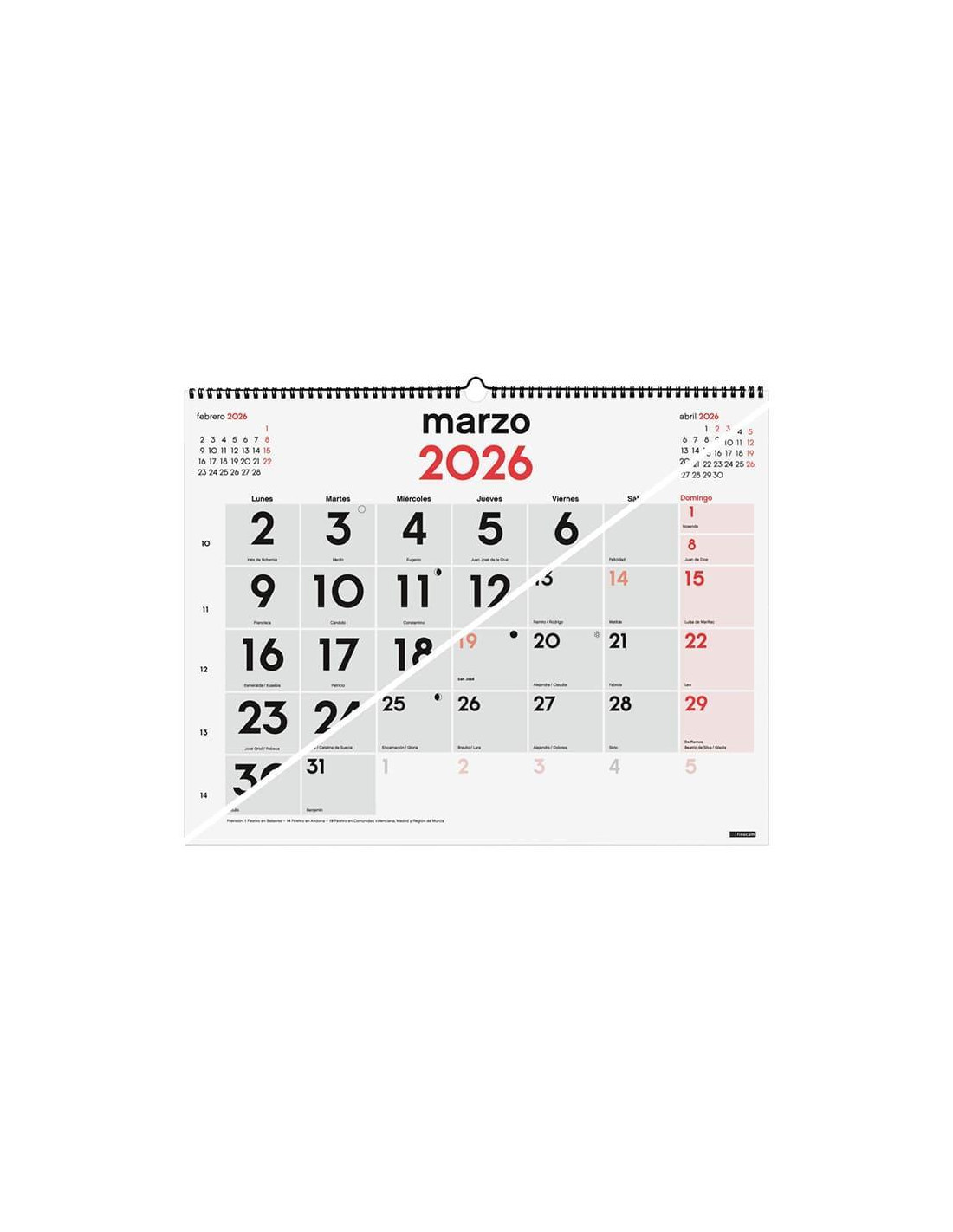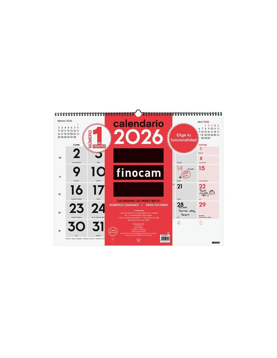 Calendario de pared de gran formato. Con doble funcionalidad a escoger: en una cara, el mes con espacio diario para anotaciones, y en la otra cara, el mes con números grandes. Encuadernado con doble espiral y colgador. Con mes anterior y posterior en cada página. Contiene información útil y de interés; onomástica, festivos, cambios de estación, etc. Papel de 135gr. FSC. Formato: 54x42cm.
