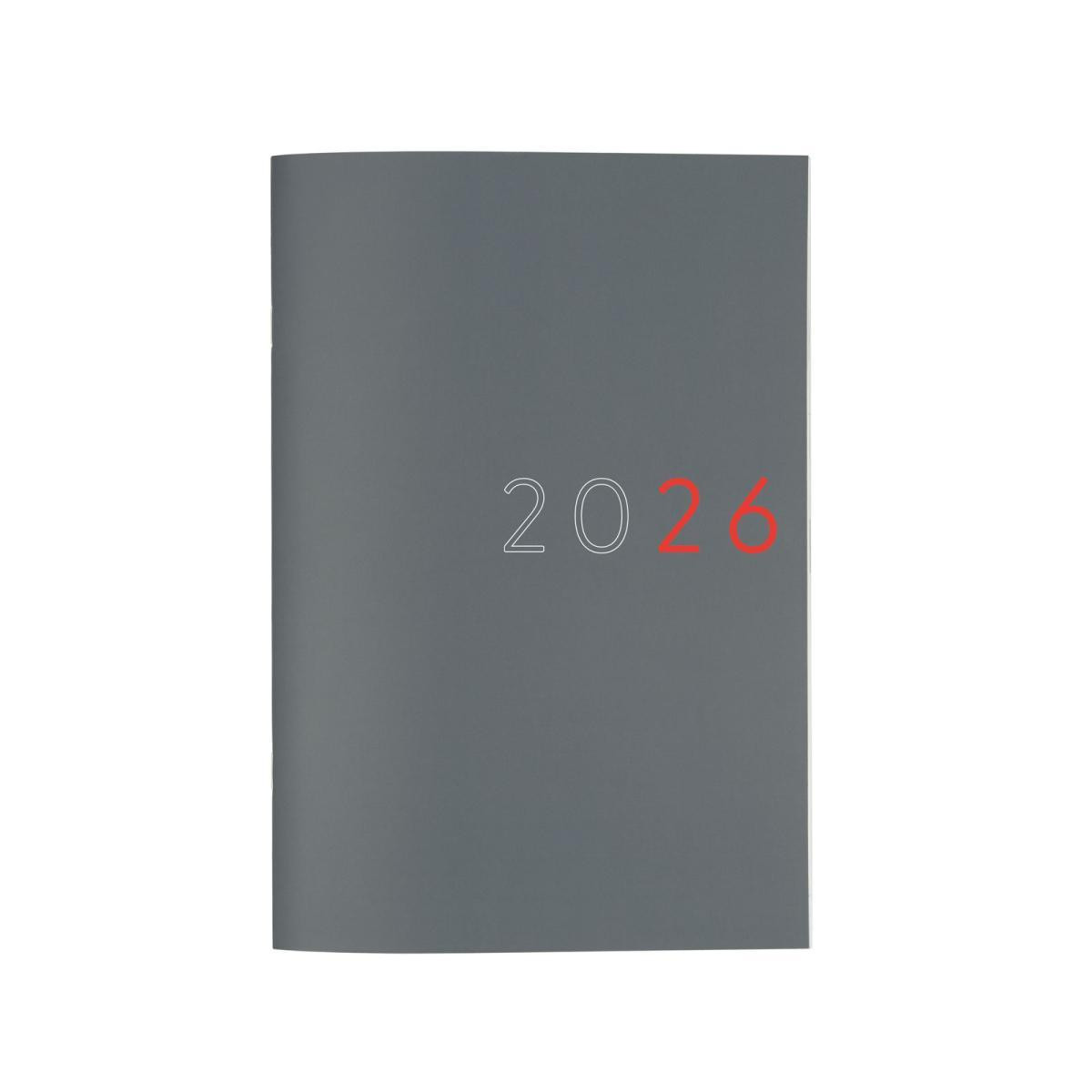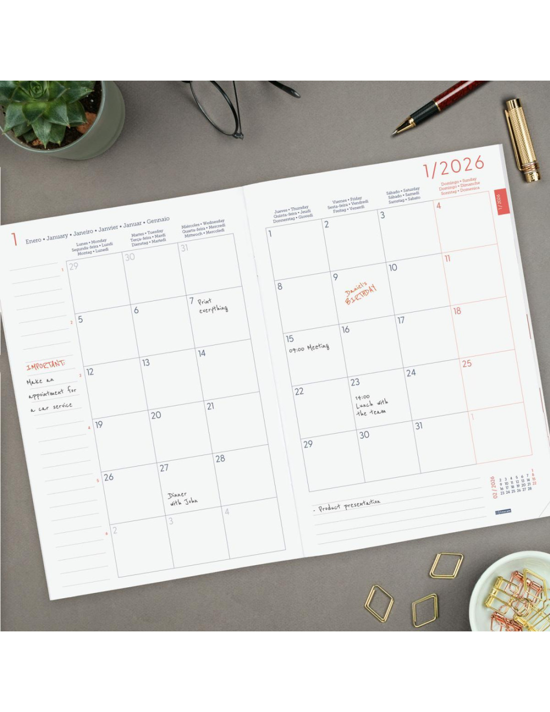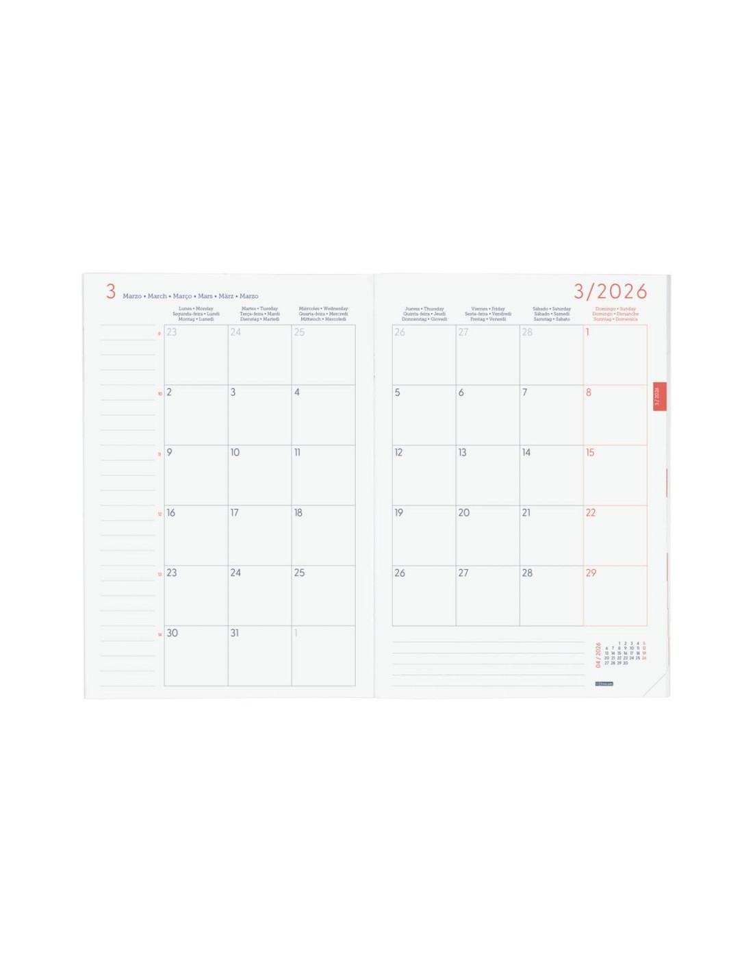 Libreta para la planificación mensual, tapas de polipropileno y uñero microperforado. Encuadernación grapada. Visión del mes en la hoja inferior y espacio para anotar tareas. Contiene calendarios y festivos. Cabecera en español, inglés, portugués, francés, alemán e italiano. Papel de 120gr. FSC. Formato: 16,5x24cm.