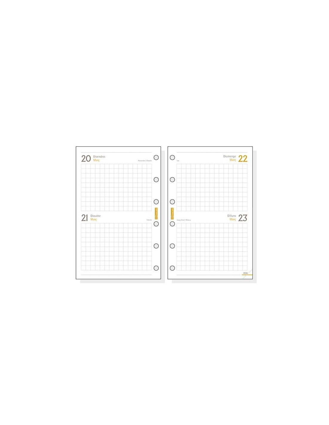Recambio anual para agenda de anillas. Con esquinas microperforadas para localizar rápidamente el día en curso. Papel de 70gr FSC® con 6 taladros. Posibilidad de anotar cada día en un espacio amplio sin horario. Recambio con 2 días página, con Sábados y Domingos completos. Contiene datos personales, onomástica, festivos, fechas a destacar, calendarios, plan anual desplegable, etc. Este recambio te permite conservar la cubierta de la agenda sustituyendo anualmente el recambio del mismo formato.