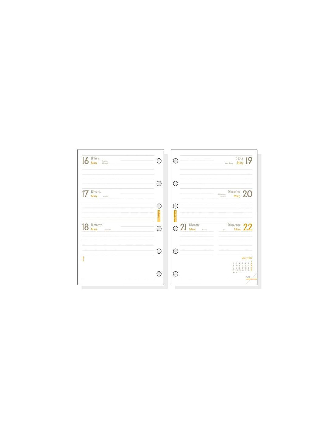 Recambio anual para agenda de anillas. Con esquinas microperforadas para localizar rápidamente el día en curso. Papel de 80gr FSC® con 6 taladros. Recambio con visión de la semana completa, permite una mejor organización. Contiene datos personales, onomástica, festivos, fechas a destacar, calendarios, plan anual desplegable, etc. Este recambio te permite conservar la cubierta de la agenda sustituyendo anualmente el recambio del mismo formato.