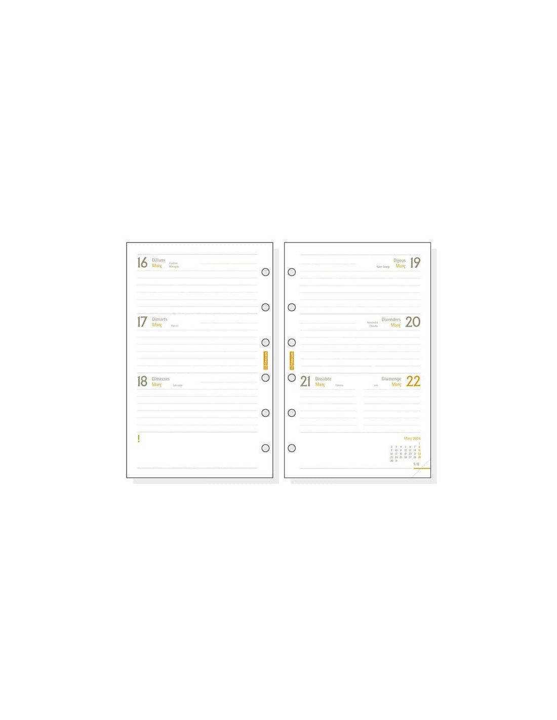 Recambio anual para agenda de anillas. Con esquinas microperforadas para localizar rápidamente el día en curso. Papel de 80gr FSC® con 6 taladros. Recambio con visión de la semana completa, permite una mejor organización. Contiene datos personales, onomástica, festivos, fechas a destacar, calendarios, plan anual desplegable, etc. Este recambio te permite conservar la cubierta de la agenda sustituyendo anualmente el recambio del mismo formato.