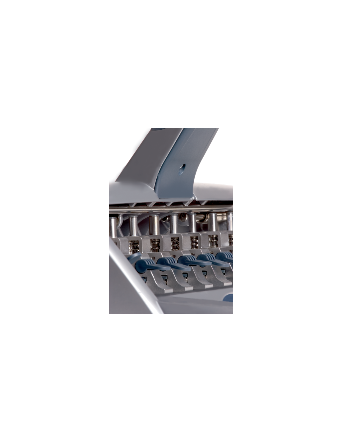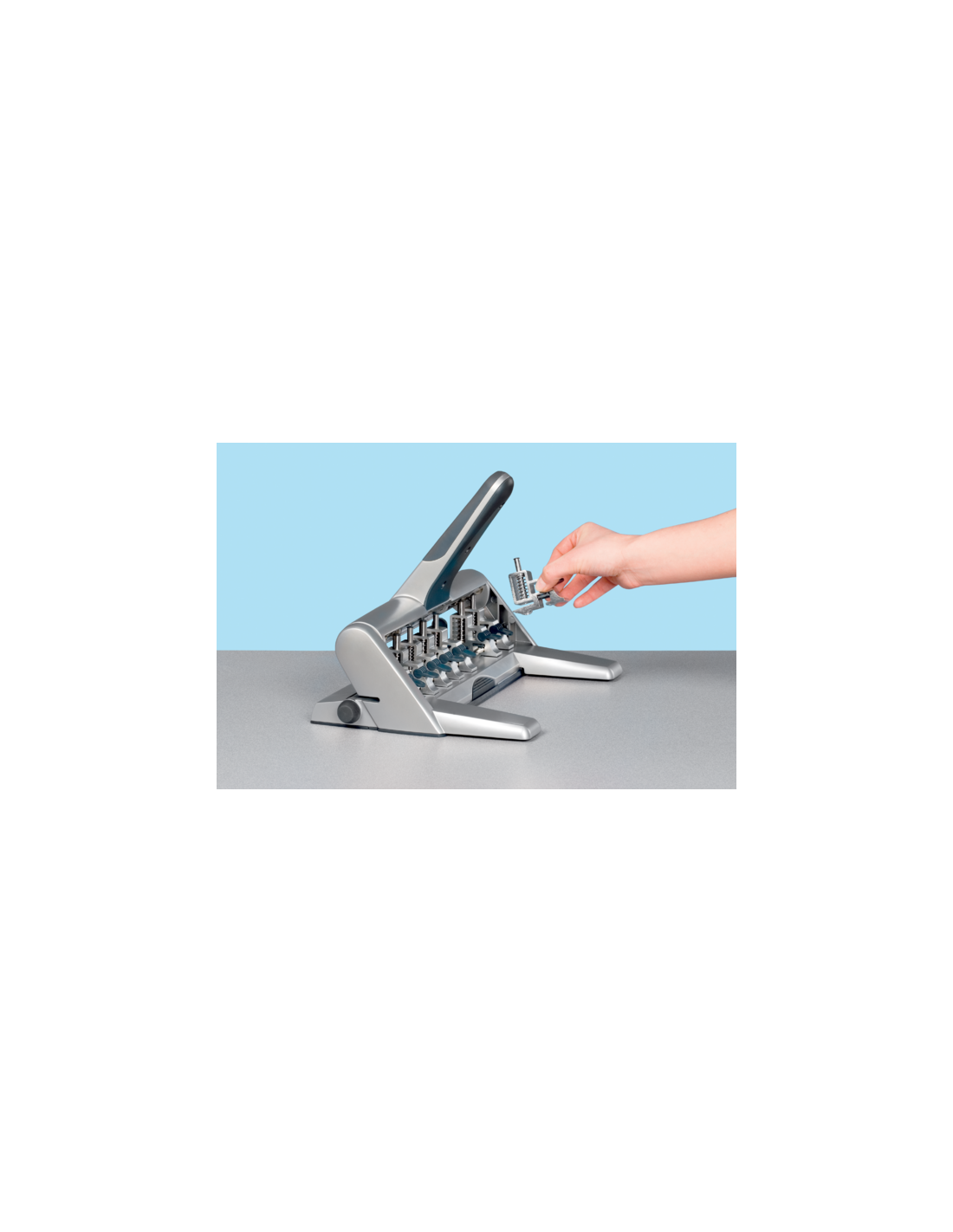 Taladro de punzones móviles, dispone de 8 posiciones posibles para diferentes tipos de perforación. Se sirve con 4 punzones movibles, aunque admite hasta 6 punzones (6 u 8 mm de diámetro). Los punzones son fáciles de instalar gracias al mecanismo de sujec