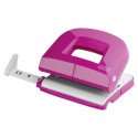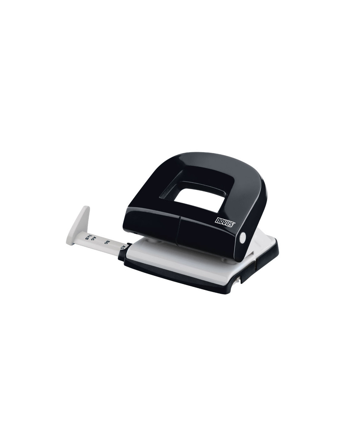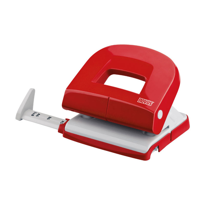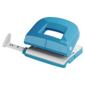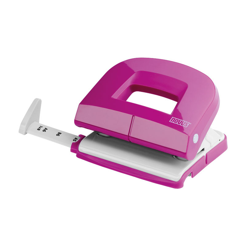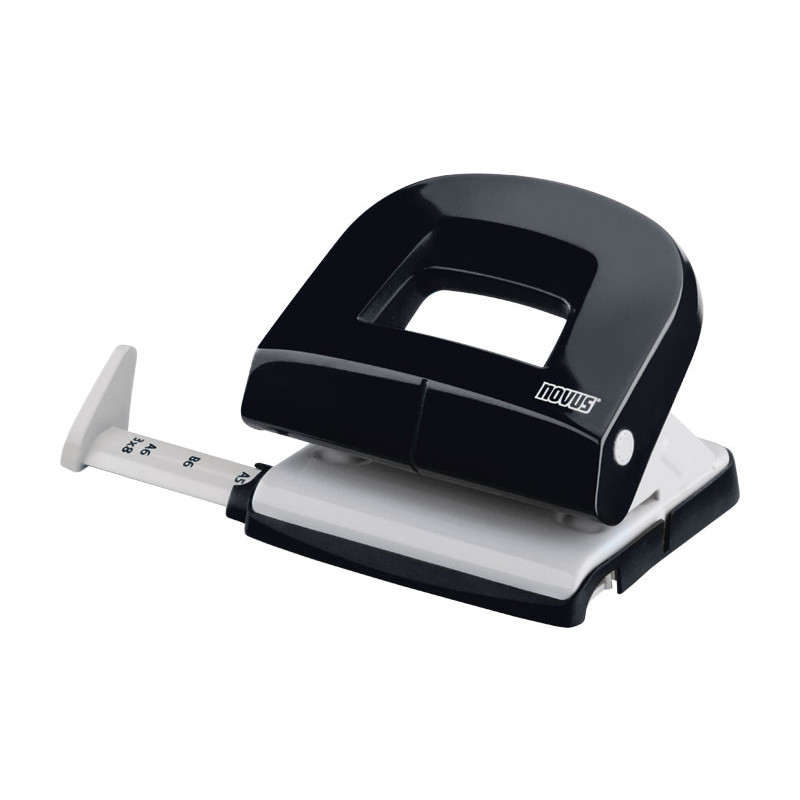 Taladro con base de goma blanda, permite abrir sólo la mitad para poderla vaciar, cerrándose de nuevo fácilmente. Capacidad de perforación de hasta 16 hojas. Perforadora con 2 taladros, distancia de 8cm. entre ellos. Regleta de tope de papel graduada con