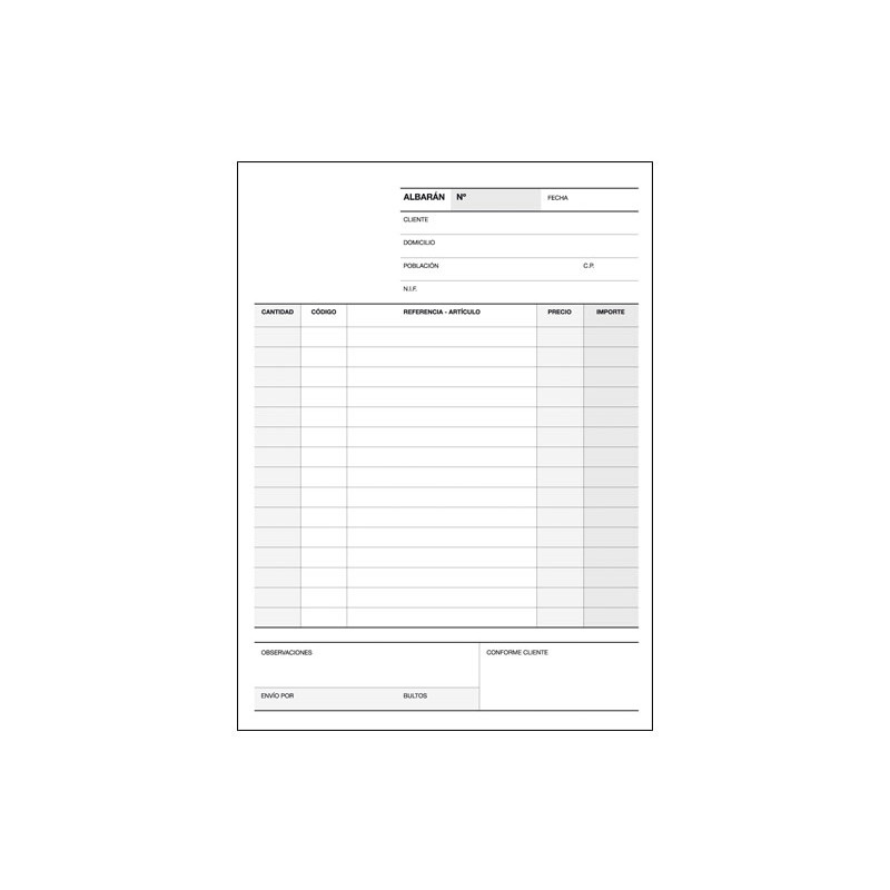 Talonario de albaranes en formato 1/4 natural (145x210mm.). Con 50 hojas microperforadas de 60 g/m². Papel triplicado modelo A-122. Incluye cartón separador para escribir sin que traspase. Original en color blanco, primera copia en azul y segunda copia en