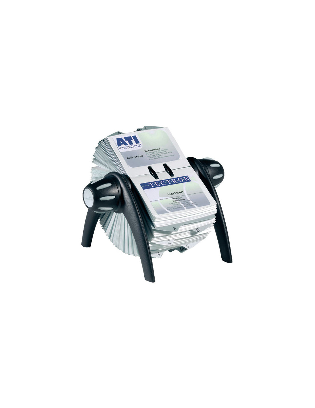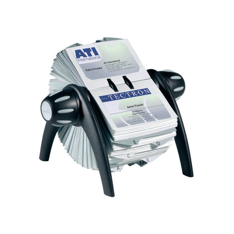 Tarjetero rotativo para tarjetas de visita. Incluye 200 fundas tamaño 72 x 104 mm con capacidad para 400 tarjetas de visita y 25 separadores con impresión alfabética de la A a la Z. El diseño de las fundas permite una fácil inserción, extracción y marcaci